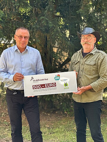 Insgesamt wurden 468 Lose verkauft und wir als Stadtwerke Freiberg haben den Betrag auf 500 Euro aufgerundet. Zur symbolischen Scheckübergabe trafen sich letzten Donnerstag unser Vorstandsvorsitzender Axel Schneegans und Peter Heinrich, Parkleiter des Tierparks Freiberg.